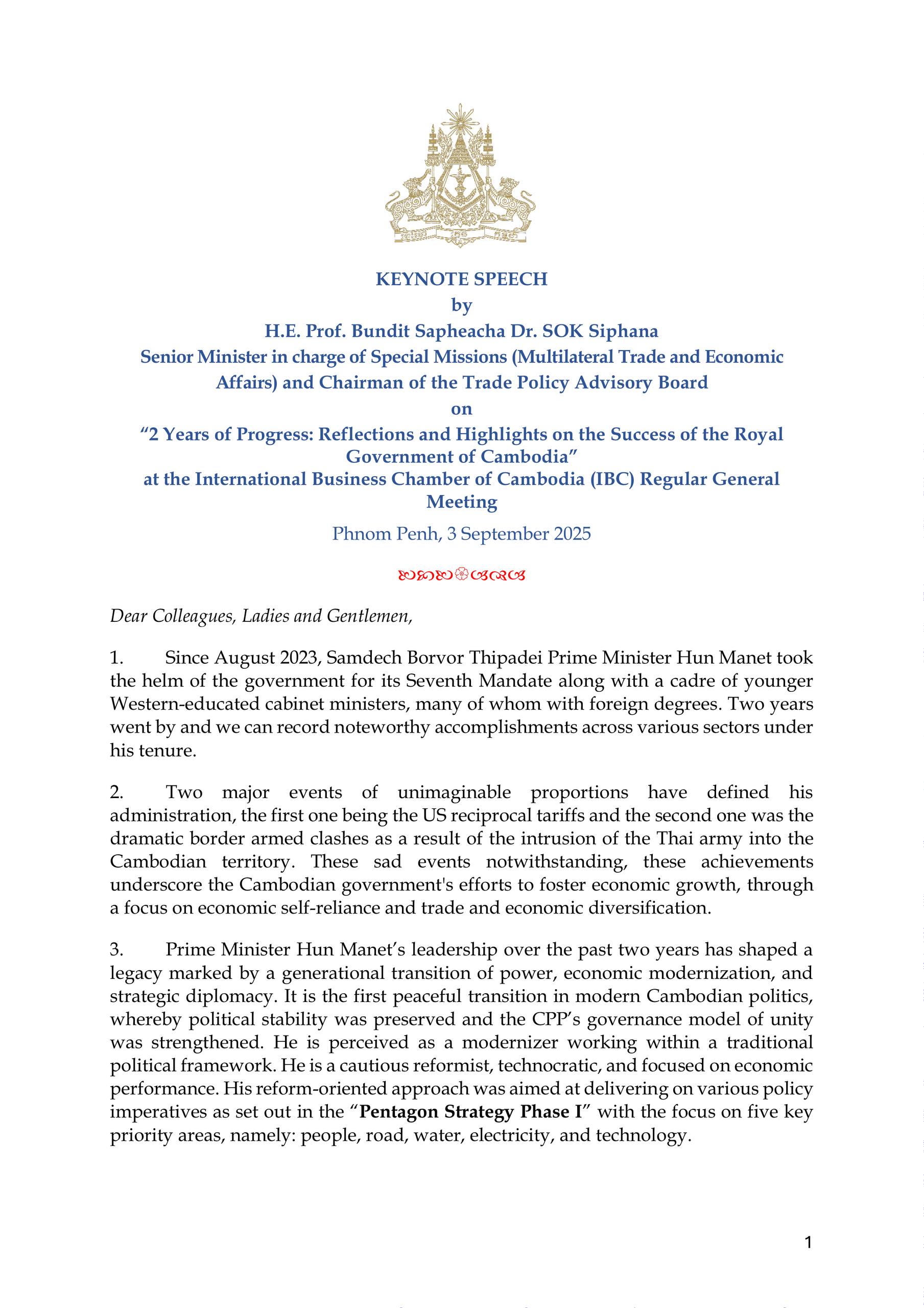 On September 3, 2025, H.E. Prof. Bundit Sapheacha Dr. SOK Siphana, Senior Minister in charge of Special Missions (Multilateral Trade and Economic Affairs) and Chairman of the Trade Policy Advisory Board (TPAB), delivered a keynote address at the International Business Chamber of Cambodia (IBC)’s Regular General Meeting.