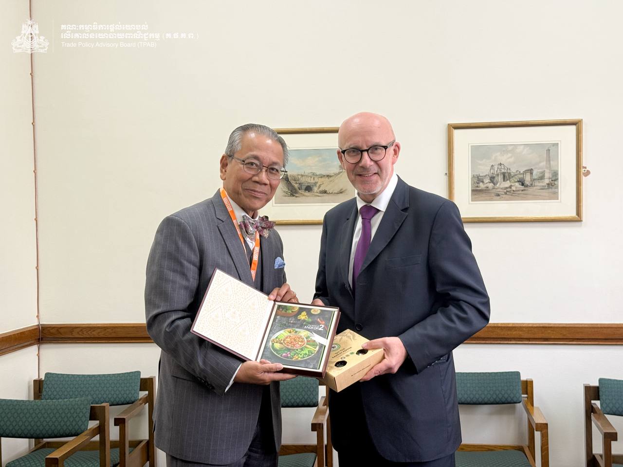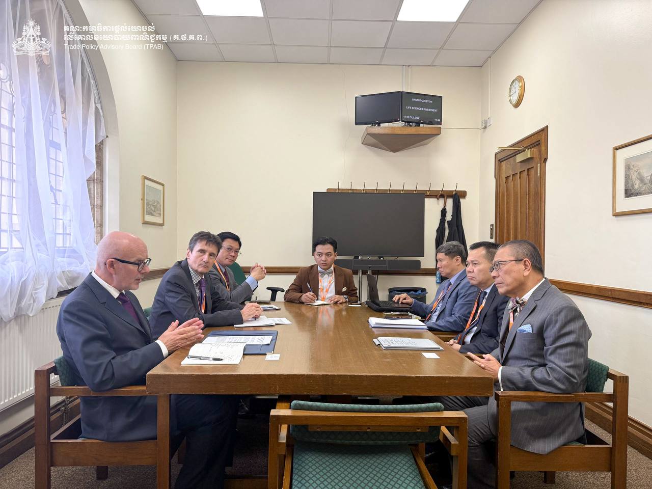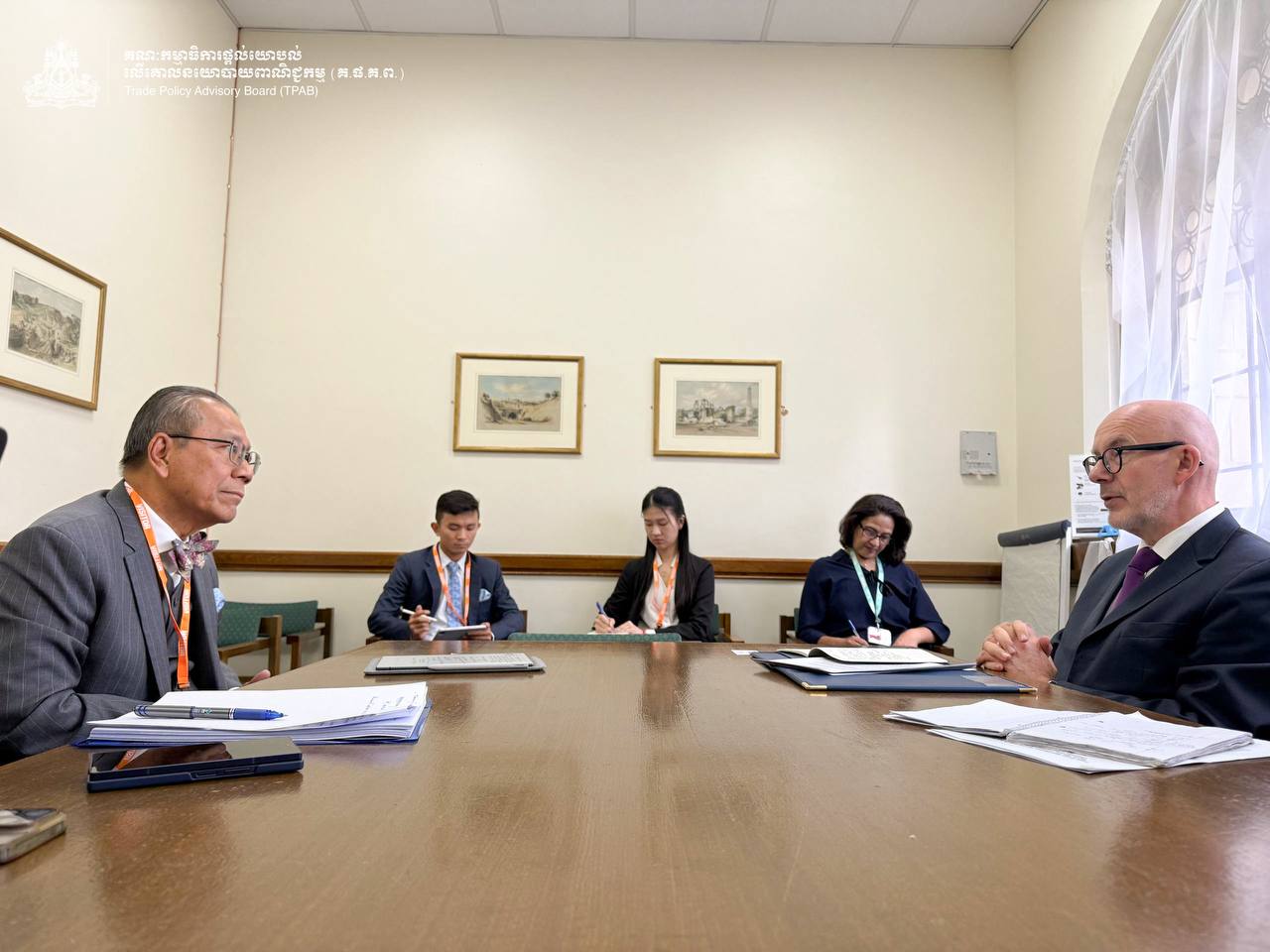 The meeting discussed Cambodia’s commitment to international trade and a free economy, shared lessons from its WTO accession, and explored future cooperation with the UK in key sectors such as agriculture, renewable energy, education, manufacturing, security, and sports.