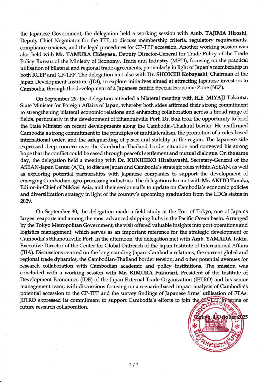 Press Release on the Outcomes of the Comprehensive and Progressive Agreement for the Trans-Pacific Partnership (CP-TPP) Fact Finding Mission to Japan, Led by H.E. Prof. Bundit Sapheacha Dr. Sok Siphana, Senior Minister in charge of Special Missions, Chairman of the Trade Policy Advisory Board (TPAB), and Chairman of the CP-TPP Study Working Group.