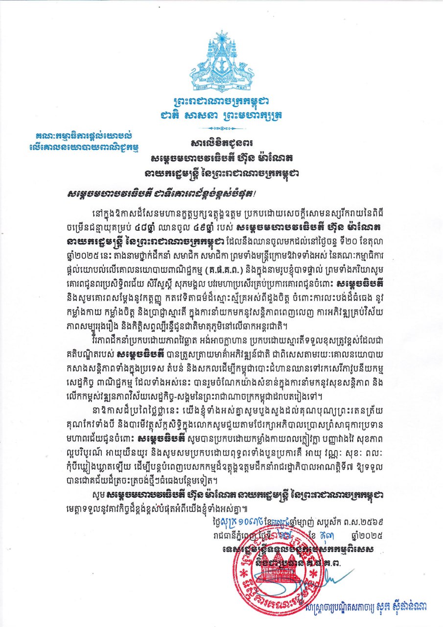 A Wishing Letter to Samdech Moha Borvor Thipadei HUN Manet, Prime Minister of the Kingdom of Cambodia, in celebration of his 48th Birthday.