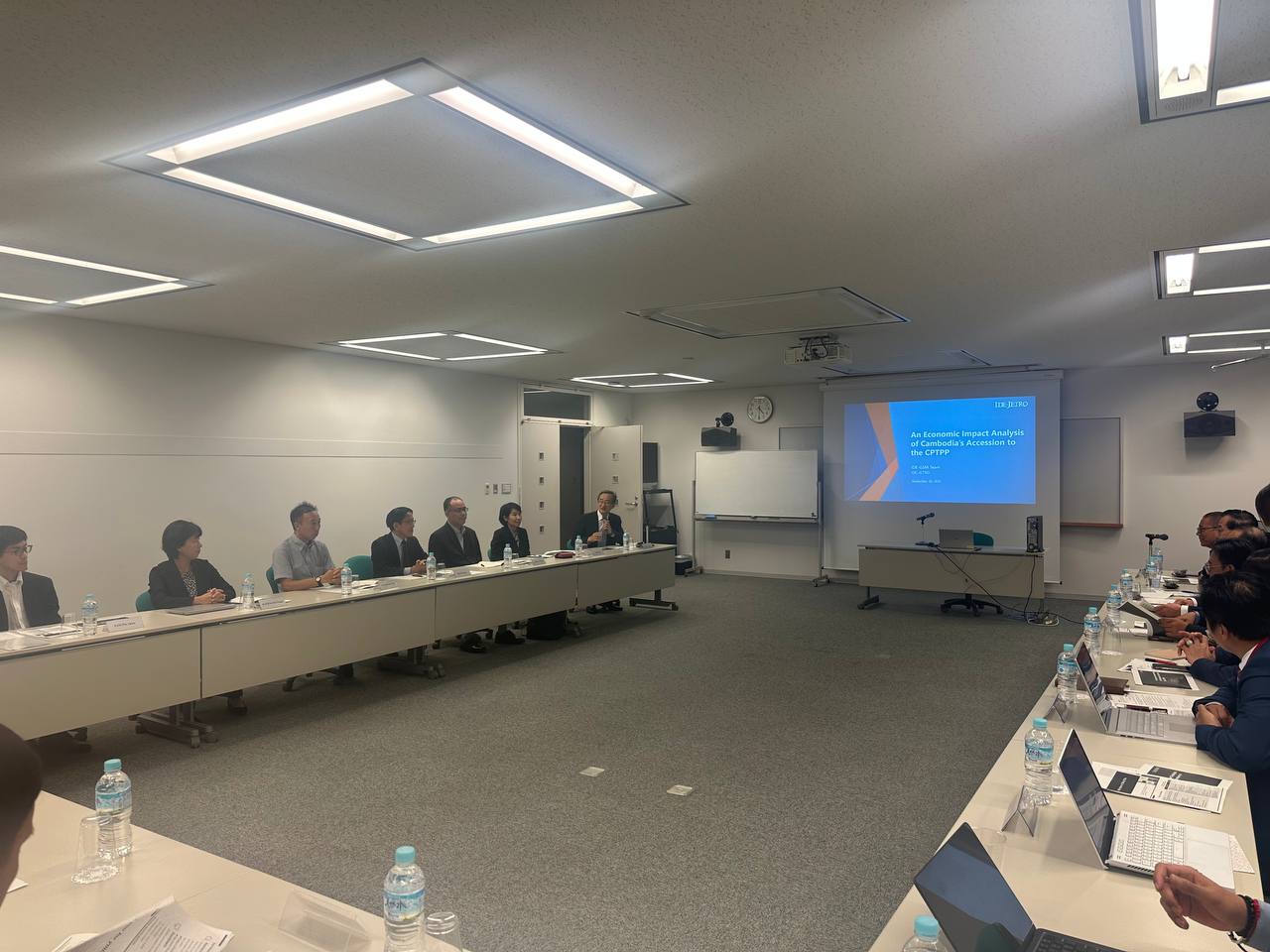 The discussion focused on the scenario-based analysis of Cambodia’s potential CP-TPP membership and the survey results on the number of Japanese companies utilizing free trade agreements, which led to JETRO’s commitment to support Cambodia in joining the CP-TPP under the framework of future research cooperation.
