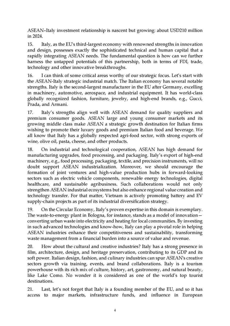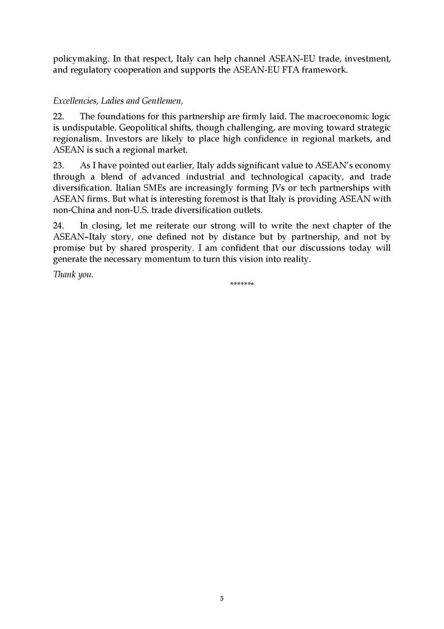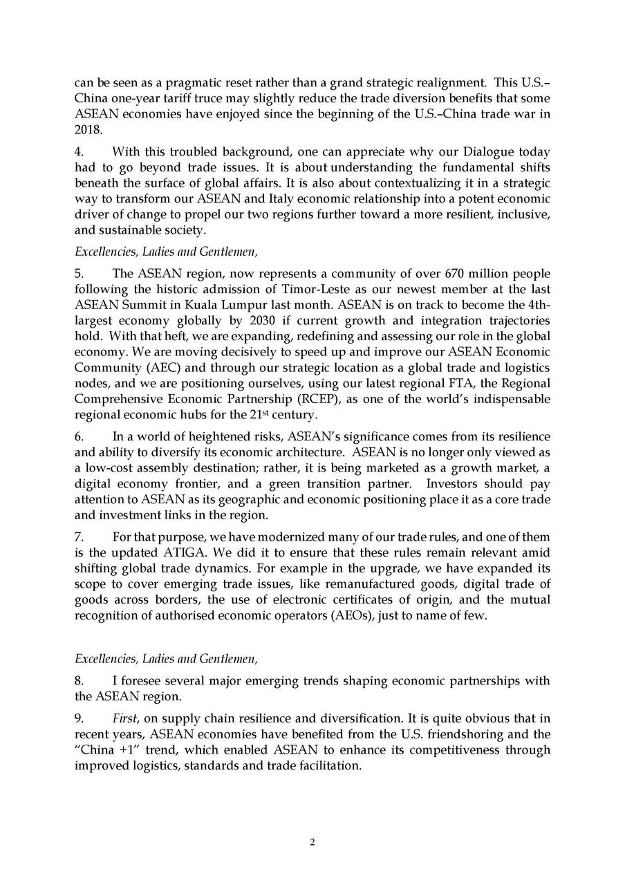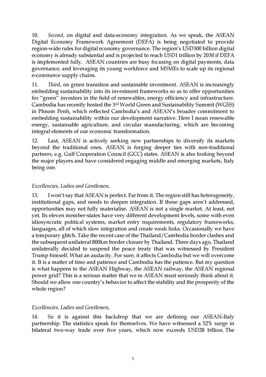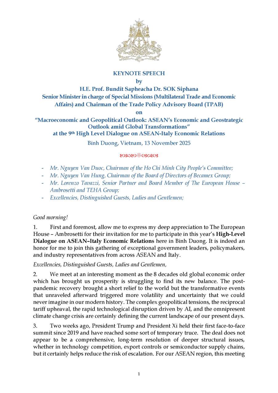 On 13 November 2025, H.E. Prof. Bundit Sapheacha Dr. SOK Siphana, Senior Minister in charge of Special Missions (Multilateral Trade and Economic Affairs), and Chairman of the Trade Policy Advisory Board (TPAB), was invited to deliver a Keynote Speech at the 9th High-Level Dialogue of the ASEAN-Italy Economic Relations, under the topic “Macroeconomic and Geopolitical Outlook: ASEAN’s Economic and Geostrategic Outlook Amid Global Transformations”.
