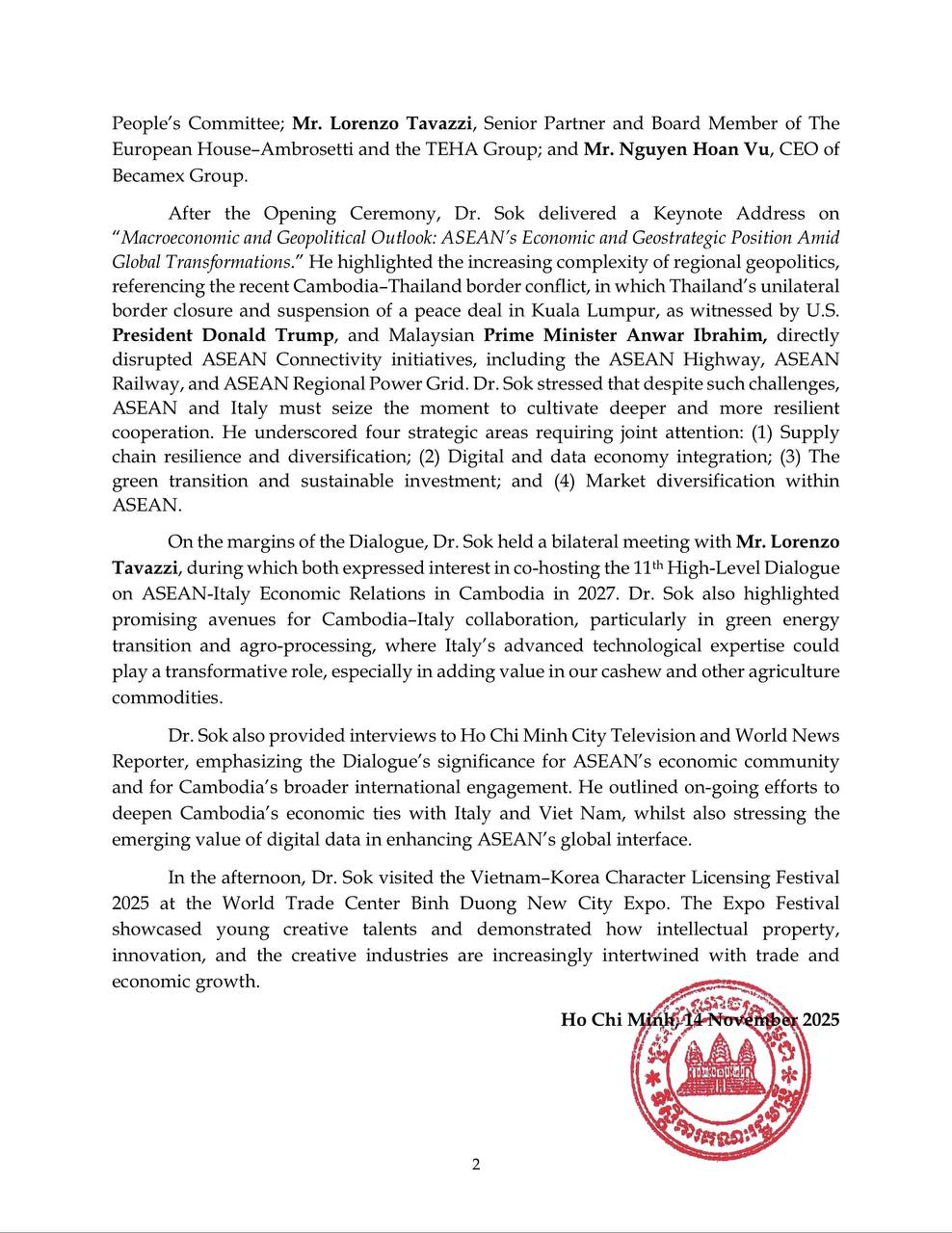 Press Release on the Outcomes of the Participation of H.E. Prof. Bundit Sapheacha Dr. Sok Siphana, Senior Minister in charge of Special Missions, and Chairman of the Trade Policy Advisory Board (TPAB), at the 9th High-Level Dialogue on ASEAN-Italy Economic Relations and Related Meetings.