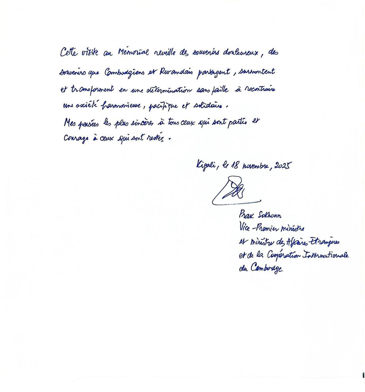 On 18 November 2025, H.E. Prof. Bundit Sapheacha Dr. SOK Siphana, Senior Minister in charge of Special Missions (Multilateral Trade and Economic Affairs) accompanied H.E. PRAK Sokhonn, Deputy Prime Minister, Minister of Foreign Affairs and International Cooperation, to a Wreath Laying Ceremony at the Kigali Genocide Memorial.