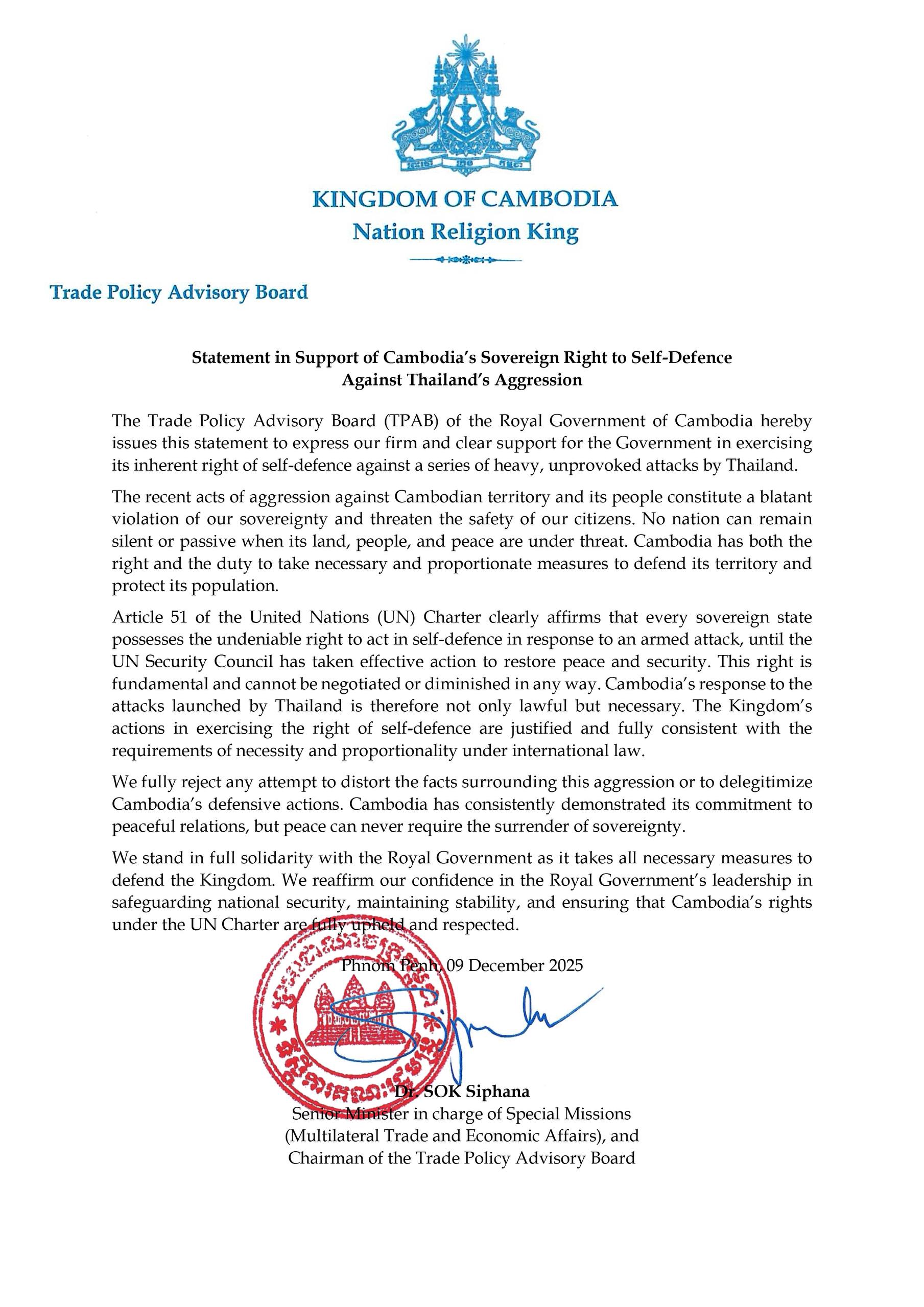 The Trade Policy Advisory Board (TPAB) issues a statement in support for the Royal Government of Cambodia in exercising its inherent right to self-defence against a series of heavy, unprovoked attacks by Thailand.
