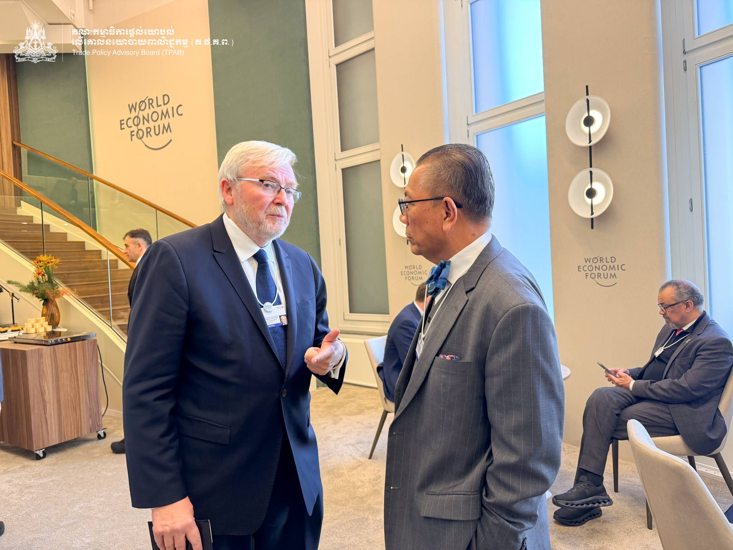 On January 20, 2026, H.E. Prof. Bundit Sapheacha Dr. SOK Siphana, Senior Minister in charge of Special Missions (Multilateral Trade and Economic Affairs) and Chairman of the Trade Policy Advisory Board (TPAB), held a discussion with H.E. Kevin Rudd, Former Prime Minister of Australia, on the margin of the World Economic Forum Annual Meeting 2026 in Davos, Switzerland.