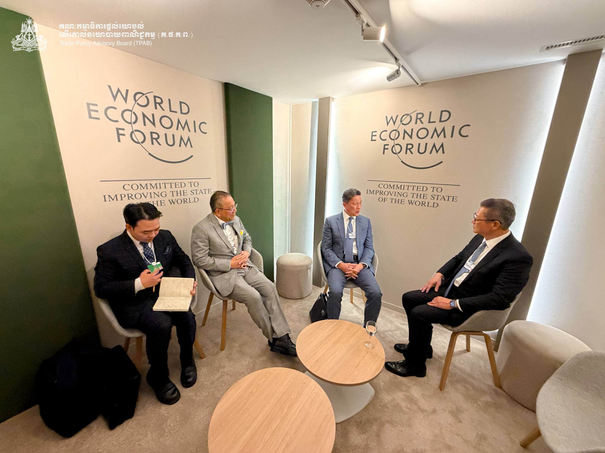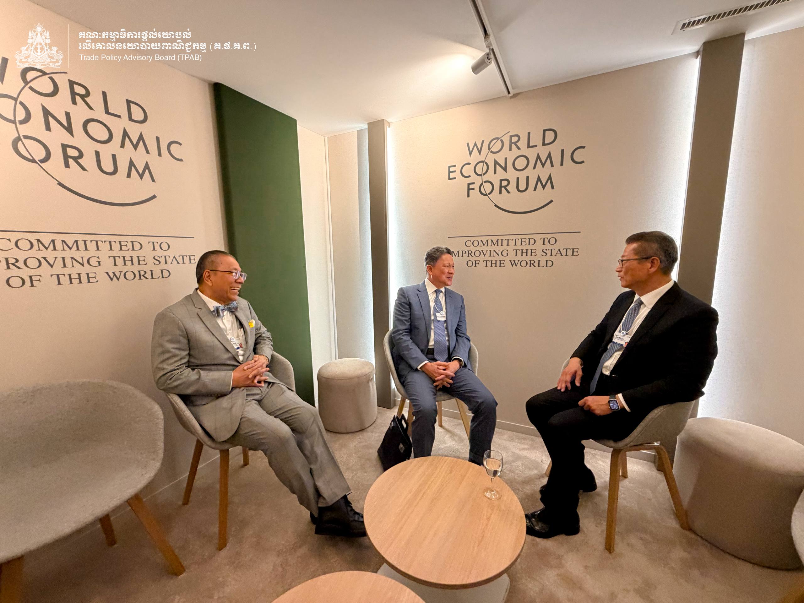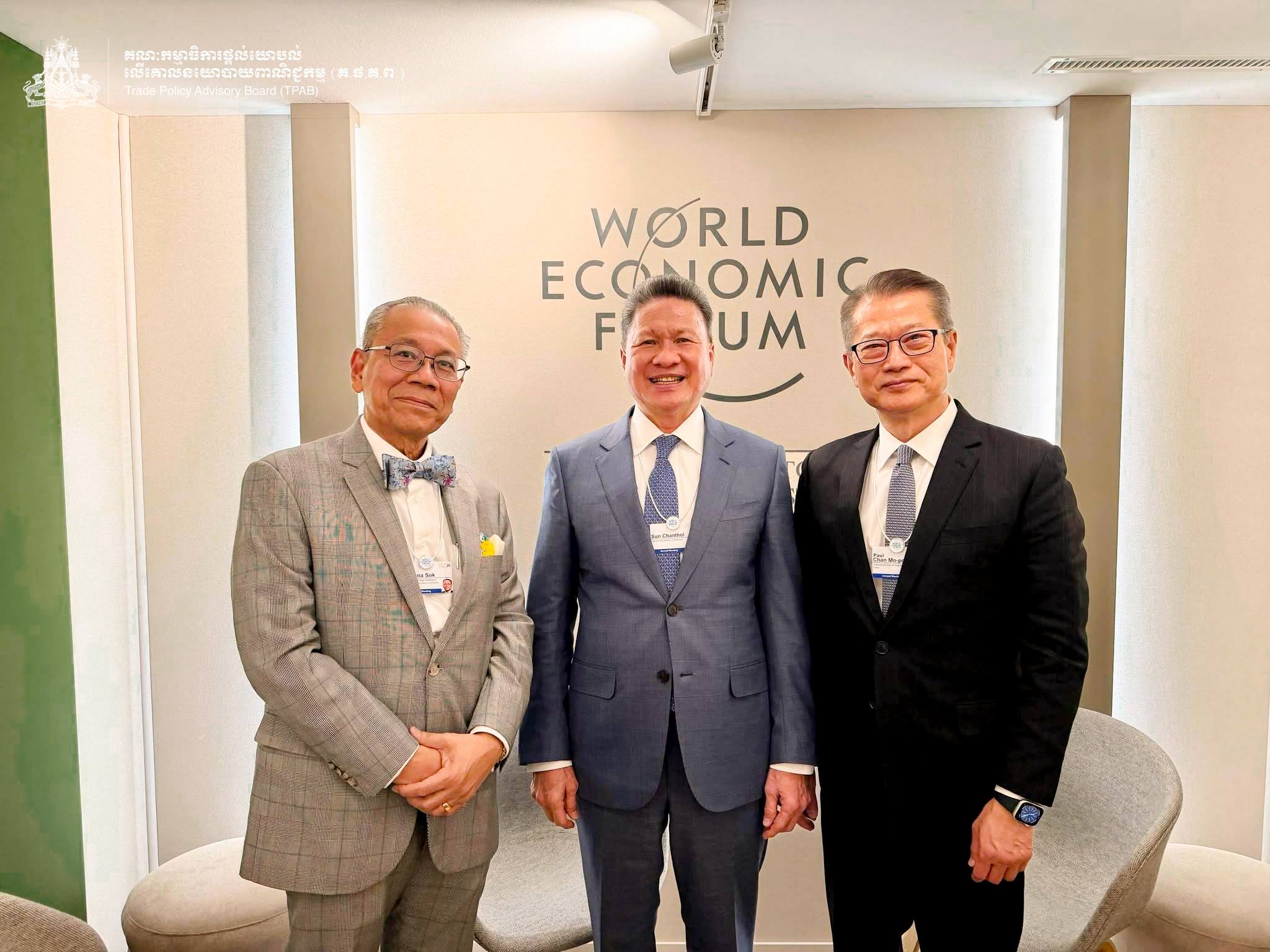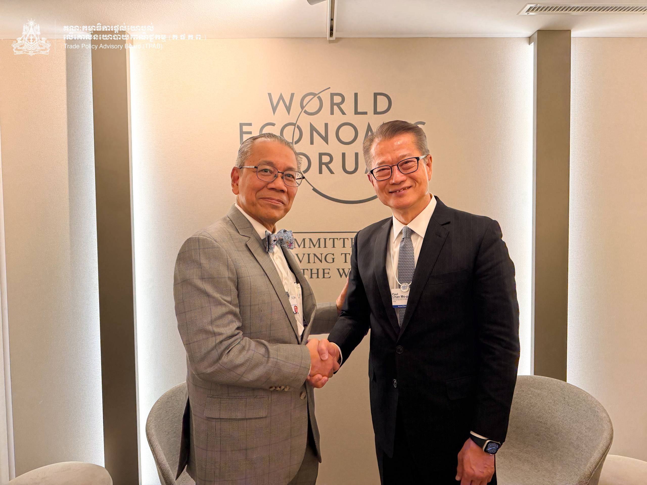 On 21 January 2026, on the margin of the World Economic Forum Annual Meeting 2026 in Davos, Switzerland, H.E. Prof. Bundit Sapheacha Dr. SOK Siphana, Senior Minister in charge of Special Missions (Multilateral Trade and Economic Affairs) and Chairman of the Trade Policy Advisory Board (TPAB), accompanied H.E. SUN Chanthol, Deputy Prime Minister and First Vice-Chairman of the Council for the Development of Cambodia (CDC), in a meeting with H.E. Paul Chan, Financial Secretary of the Hong Kong Special Administrative Region, to further strengthen cooperation between Cambodia and Hong Kong.