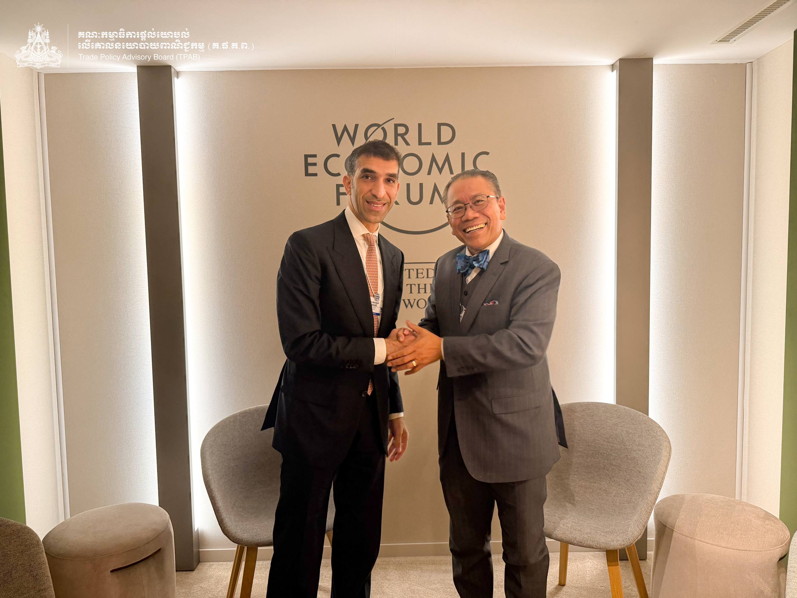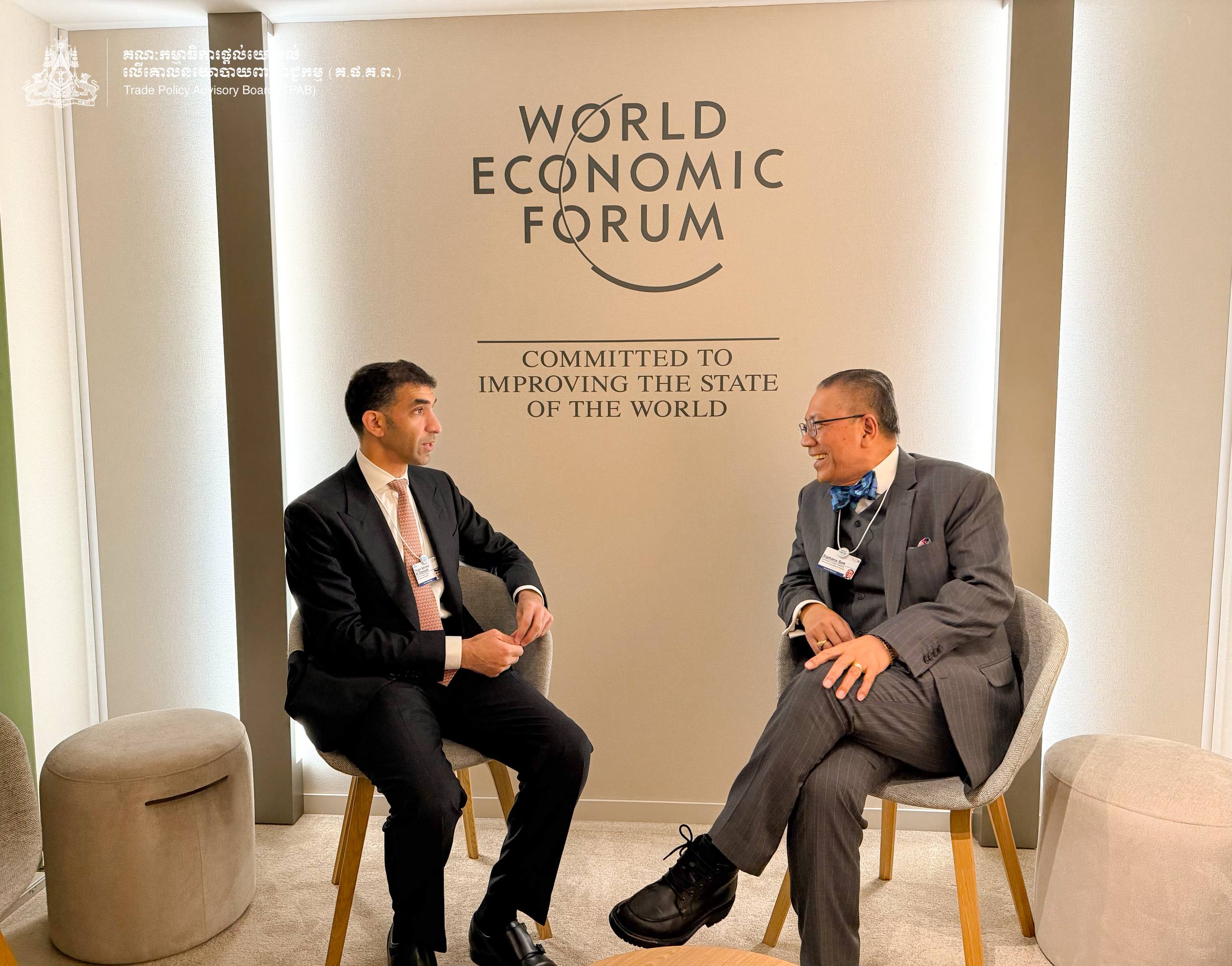 On the margin of the World Economic Forum Annual Meeting 2026 in Davos, Switzerland, on January 21, 2026, H.E. Prof. Bundit Sapheacha Dr. SOK Siphana, Senior Minister in charge of Special Missions (Multilateral Trade and Economic Affairs) and Chairman of the Trade Policy Advisory Board (TPAB), held a discussion with H.E. Thani bin Ahmed Al Zeyoudi, Minister of State for Foreign Trade of the United Arab Emirates.