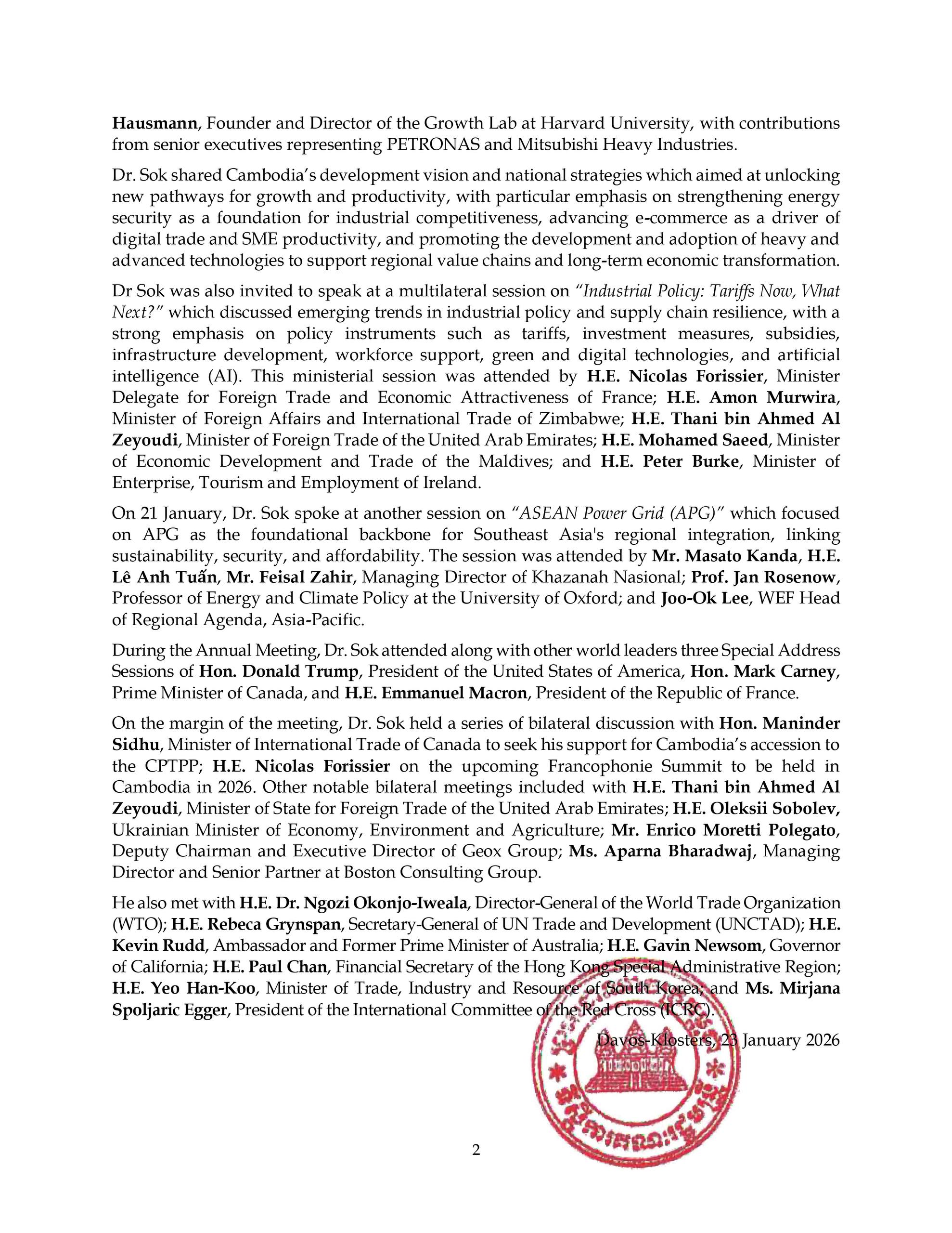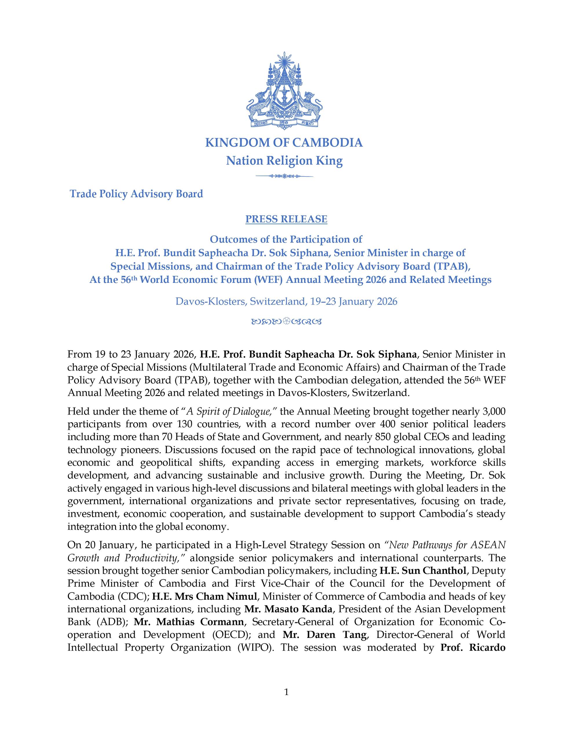 Press Release on the Outcomes of the Participation of H.E. Prof. Bundit Sapheacha Dr. Sok Siphana, Senior Minister in charge of Special Missions, and Chairman of the Trade Policy Advisory Board (TPAB), at the 56th World Economic Forum (WEF) Annual Meeting 2026 and Related Meetings.