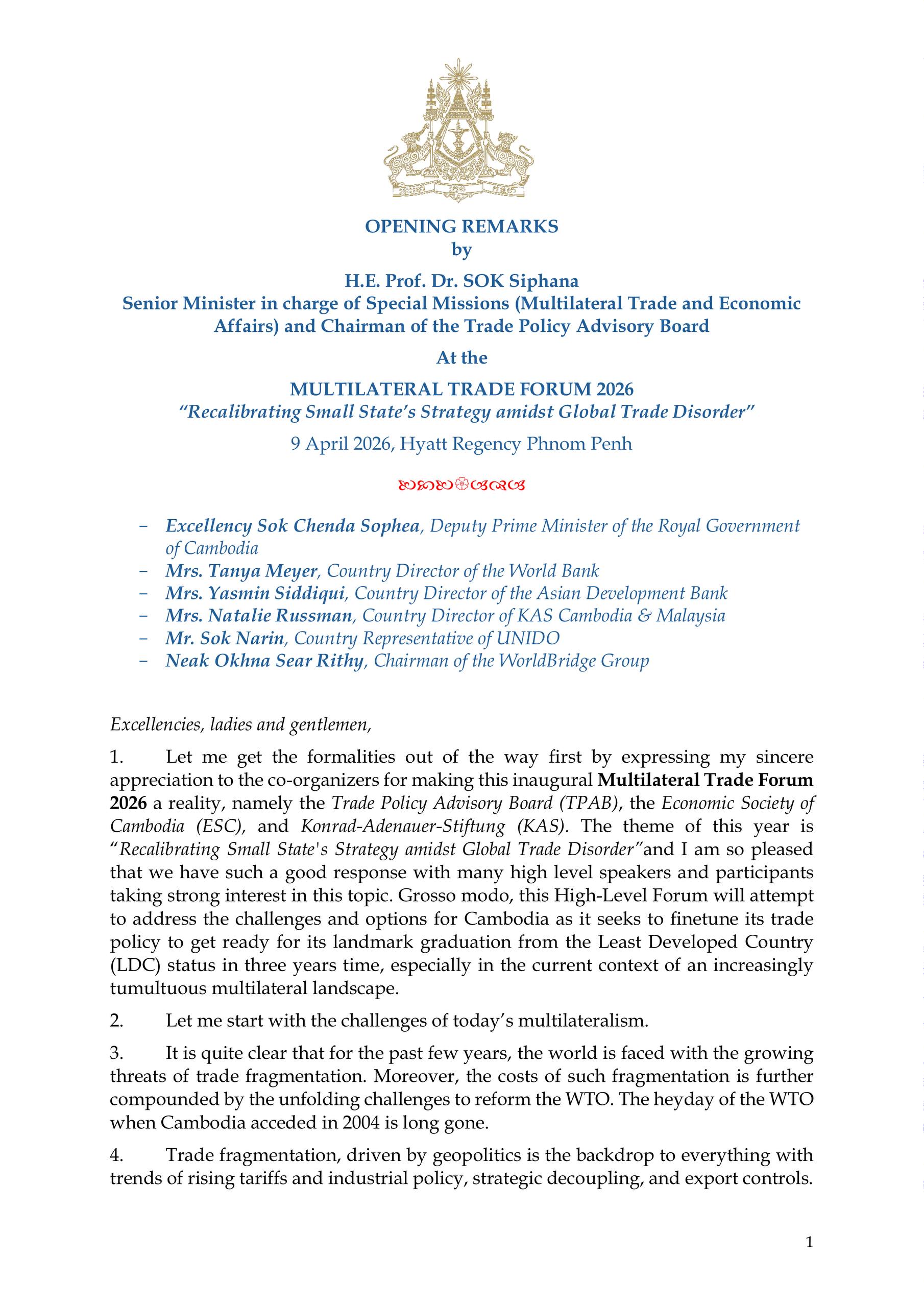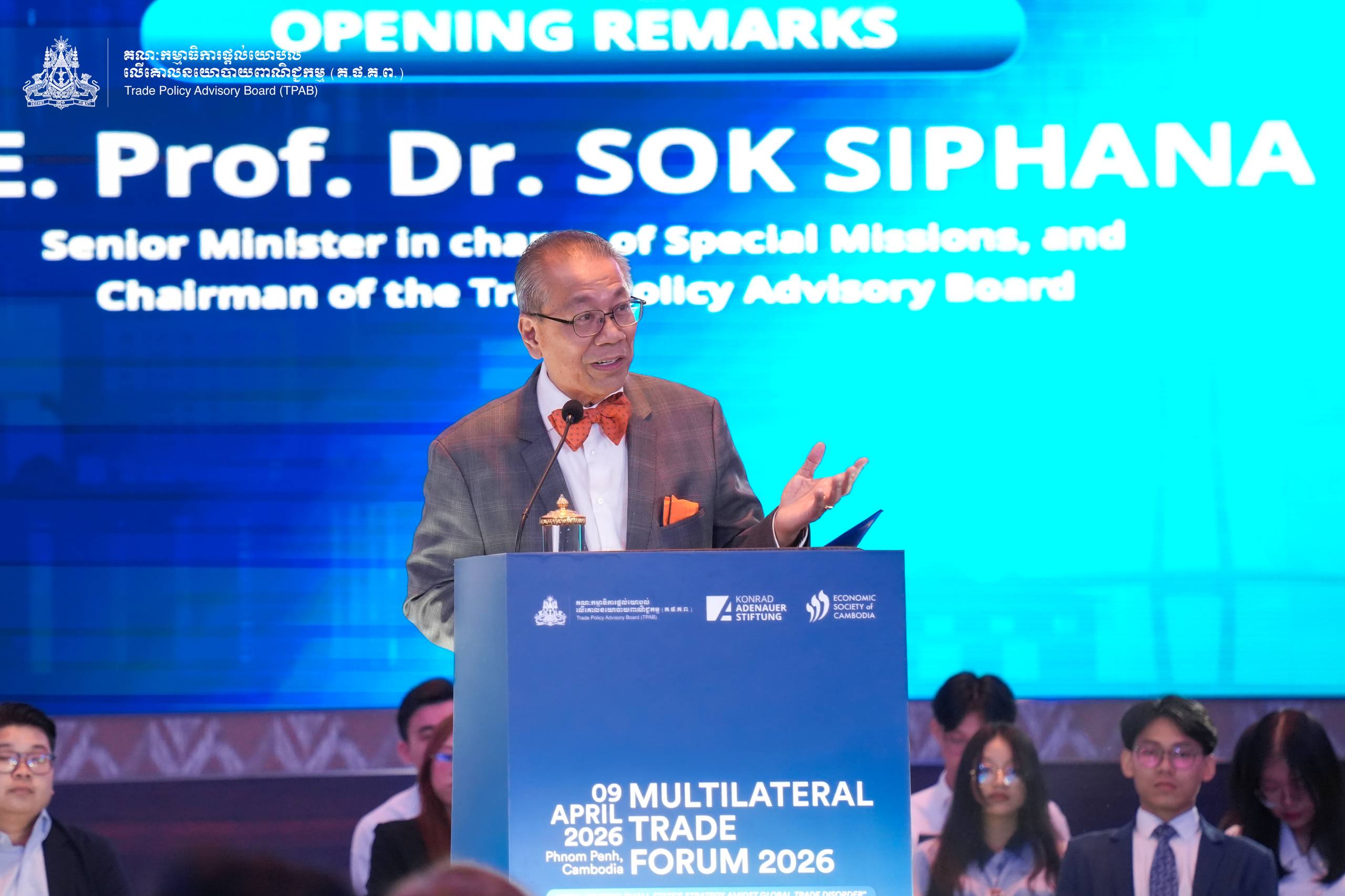 Opening Remarks of H.E. Prof. Bundit Sapheacha Dr. SOK Siphana, Senior Minister in charge of Special Missions (Multilateral Trade and Economic Affairs), and Chairman of the Trade Policy Advisory Board (TPAB), in the Opening Ceremony of the Multilateral Trade Forum (MTF) 2026, co-organized by TPAB, and Konrad-Adenauer-Stiftung (KAS) Cambodia, and the Economic Society of Cambodia (ESC).