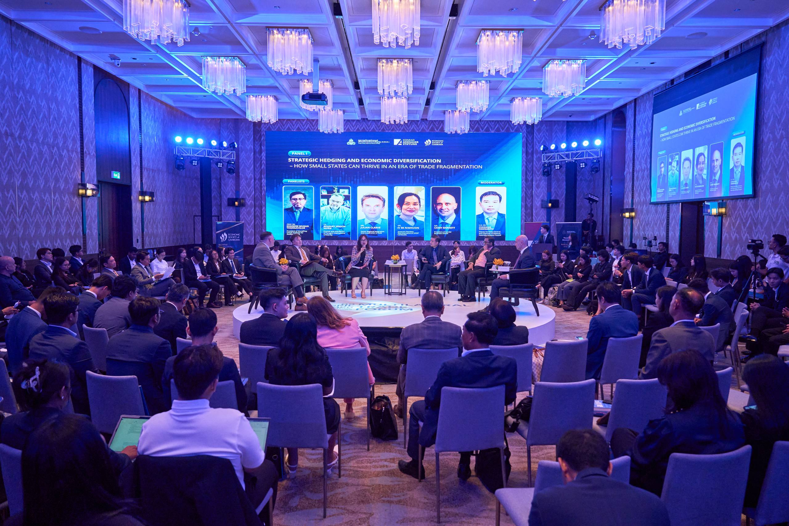 Panel I of the Multilateral Trade Forum (MTF) 2026, titled “Strategic Hedging and Economic Diversification – How Small States Can Thrive in an Era of Trade Fragmentation,” was moderated by H.E. Dr. Chheang Vannarith, Deputy Secretary-General and Chairman of the National Assembly’s Advisory Council. He was attended by a distinguished group of panelists, including Prof. Dr. Shandre Mugan Thangavelu, President of the Jeffrey Cheah Institute for Southeast Asia; Dr. Bradley Jenson Murg, Provost and Vice-Rector of Paragon International University; Mr. Julian Clarke, Senior Regional Integration and Cooperation Specialist at ADB; Ms. Iv Ek Nimnuon, Assistant Resident Representative of UNDP Cambodia; and Mr. Casey Barnett, President of CamEd Business School.