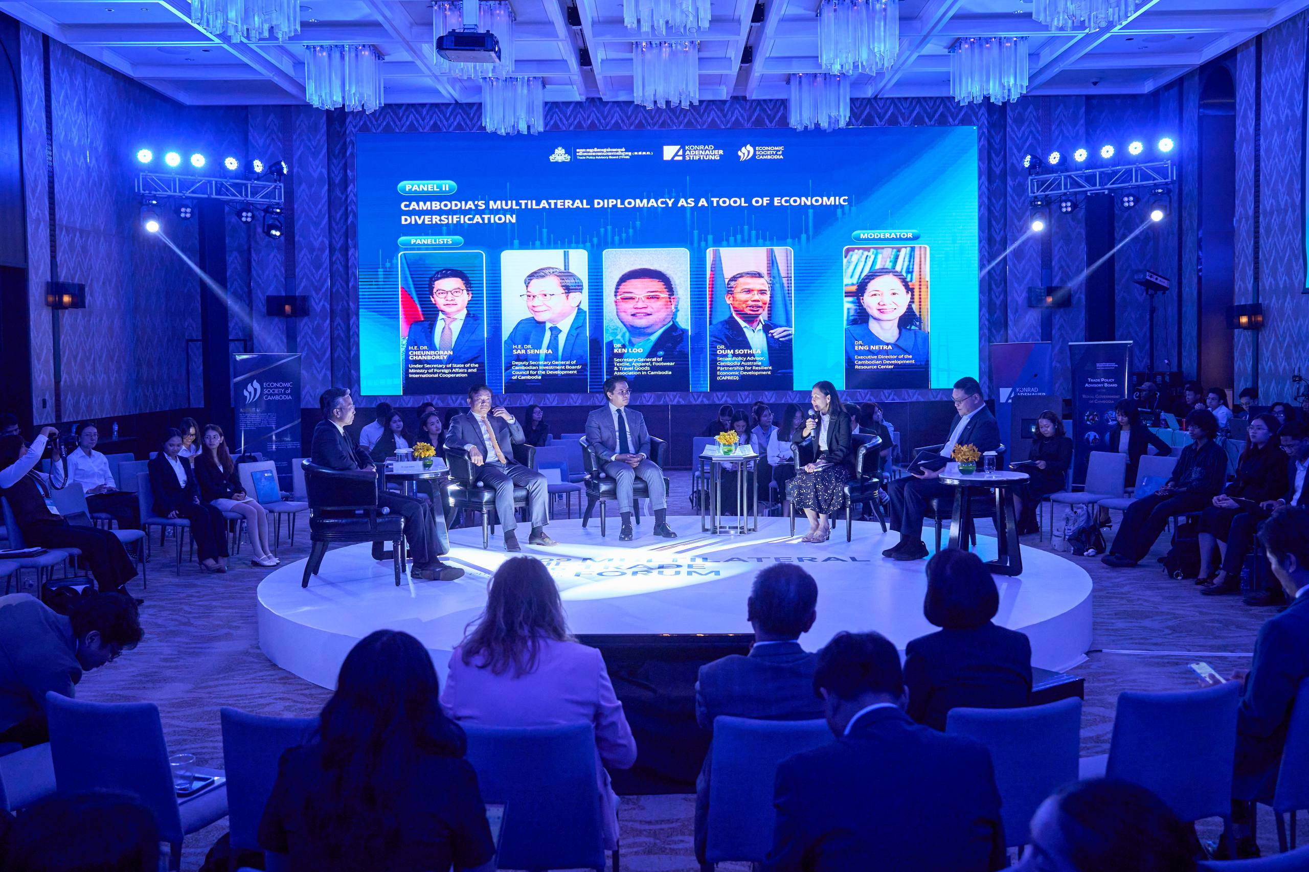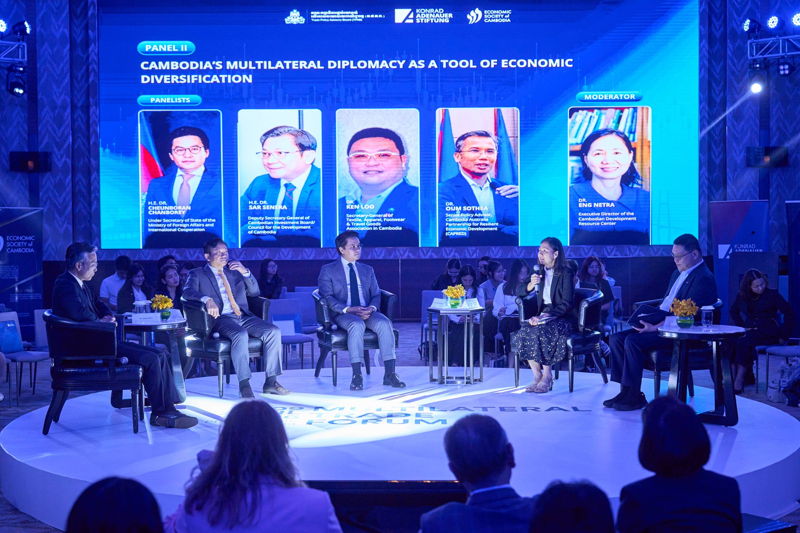 Panel II of the Multilateral Trade Forum (MTF) 2026, titled “Cambodia’s Multilateral Diplomacy as a Tool of Economic Diversification,” was moderated by Dr. Eng Netra, Executive Director of the Cambodian Development Resource Institute (CDRI), featuring H.E. Dr. Cheunboran Chanborey, Under Secretary of State, Ministry of Foreign Affairs and International Cooperation; H.E. Dr. Sar Senera, Deputy Secretary-General of Cambodian Investment Board, Council for the Development of Cambodia (CDC); Dr. Ken Loo, Secretary-General, Textile, Apparel, Footwear & Travel Goods Association in Cambodia (TAFTAC); Dr. Oum Sothea, Senior Policy Advisor, Cambodia Australia Partnership for Resilient Economic Development (CAPRED).