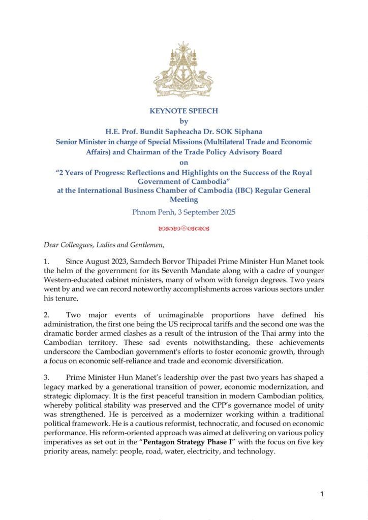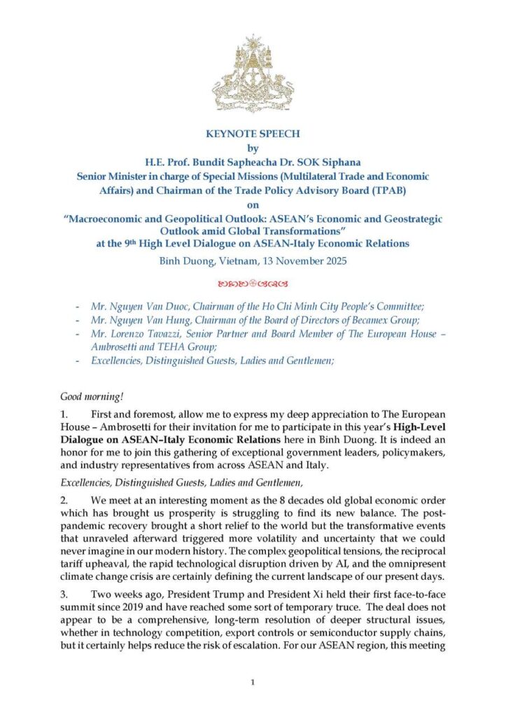 Archive | Speeches Featured | News | SpeechesThe Trade Policy Advisory Board (TPAB) Strongly Condemns Gang-Rape of Cambodian Female Migrant Worker by Thai Black Army Soldiers.March 4, 2026 Most Recent View More Featured | News | SpeechesThe Trade Policy Advisory Board (TPAB) Strongly Condemns Gang-Rape of Cambodian Female Migrant Worker by Thai Black Army Soldiers.March 4, 2026Mission | Missions Abroad | SpeechesKeynote Speech at the 9th High-Level Dialogue of the ASEAN-Italy Economic RelationsMarch 4, 2026Event | Featured | Mission | Missions Abroad | SpeechesOpening Speech of H.E. VONGSEY Vissoth, Permanent Deputy Prime Minister, in the Opening Ceremony of the 2025 World Green & Sustainability SummitFebruary 20, 2026Featured | Mission | Missions Abroad | Plenary Meeting | SpeechesIntervention – Plenary 1: Exploring commonalities and divergences across due diligence legislation, OECDFebruary 20, 2026Featured | Mission | Missions Abroad | SpeechesKeynote Address Speech at the Side-Event on Cambodia’s Development Vision in Preparation for Smooth LDC Graduation – UNCTAD 16February 20, 2026Missions Abroad | News | SpeechesIntervention at the World Trade ForumFebruary 19, 2026SpeechesKeynote Address Speech at the International Business Chamber of Cambodia (IBC) Regular General MeetingFebruary 17, 2026News | SpeechesKeynote Address Speech at the 2025 Australia-ASEAN Business ForumNovember 27, 2025News | SpeechesOpening Remark at the Navigating Trade and Investment 2025 Forum in EnglishNovember 24, 2025News | SpeechesKeynote Address Speech at the Mekong Forum 2025November 21, 2025Archive | Capacity Building | External Training | Lecture | SpeechesSpecial Lecture on “ASEAN Strategic Flexibility in a Multipolar World: Cambodia’s Perspectives”July 21, 2025SpeechesKeynote Remarks at the China-ASEAN RCEP Rules Promotion Event for Small and Medium EnterprisesJuly 18, 2025Event | News | SpeechesKeynote Remarks at the Team Canada Trade Mission Plenary SessionJuly 18, 2025Event | Mission | Missions Abroad | News | SpeechesDr. SOK Siphana’s Participation in the 2025 ASEAN Leadership and Partnership Forum, MalaysiaJuly 18, 2025Mission | Missions Abroad | News | SpeechesSamdech Thipadei’s Special Keynote Address at the 2025 ASEAN Leadership and Partnership Forum, MalaysiaJuly 18, 2025News | SpeechesKeynote Address at the Asia Pacific Sustainable Trade ForumJuly 16, 2025