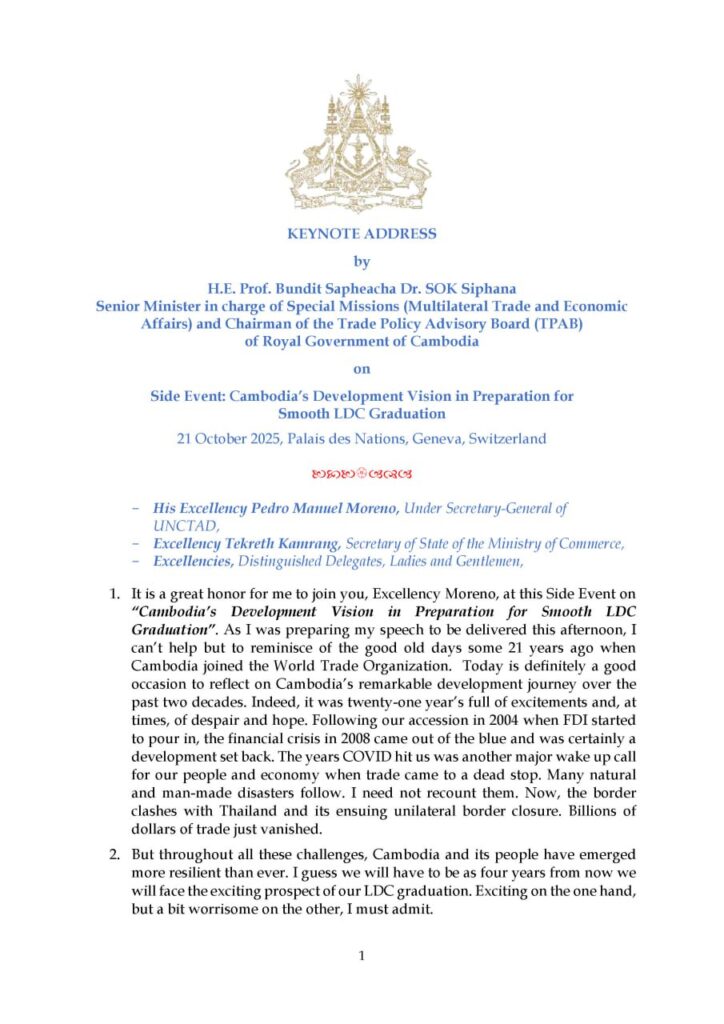Featured | Mission | Missions Abroad | SpeechesKeynote Address Speech at the Side-Event on Cambodia’s Development Vision in Preparation for Smooth LDC Graduation – UNCTAD 16February 20, 2026